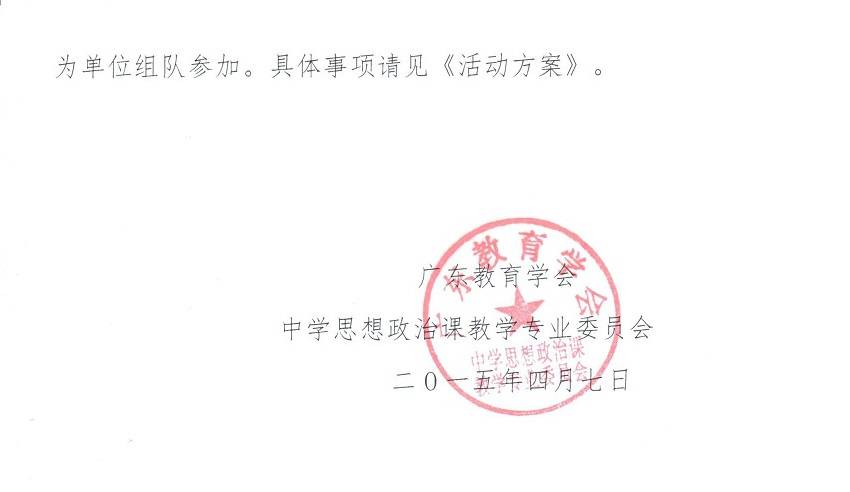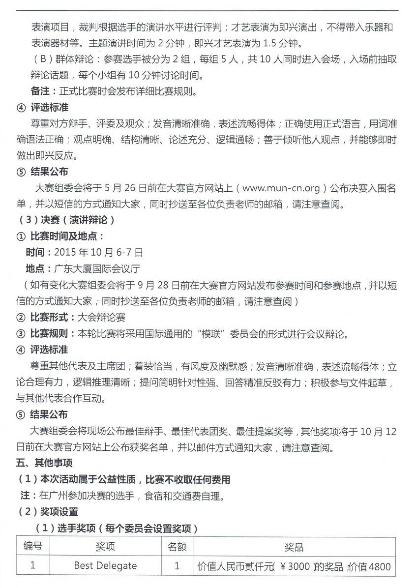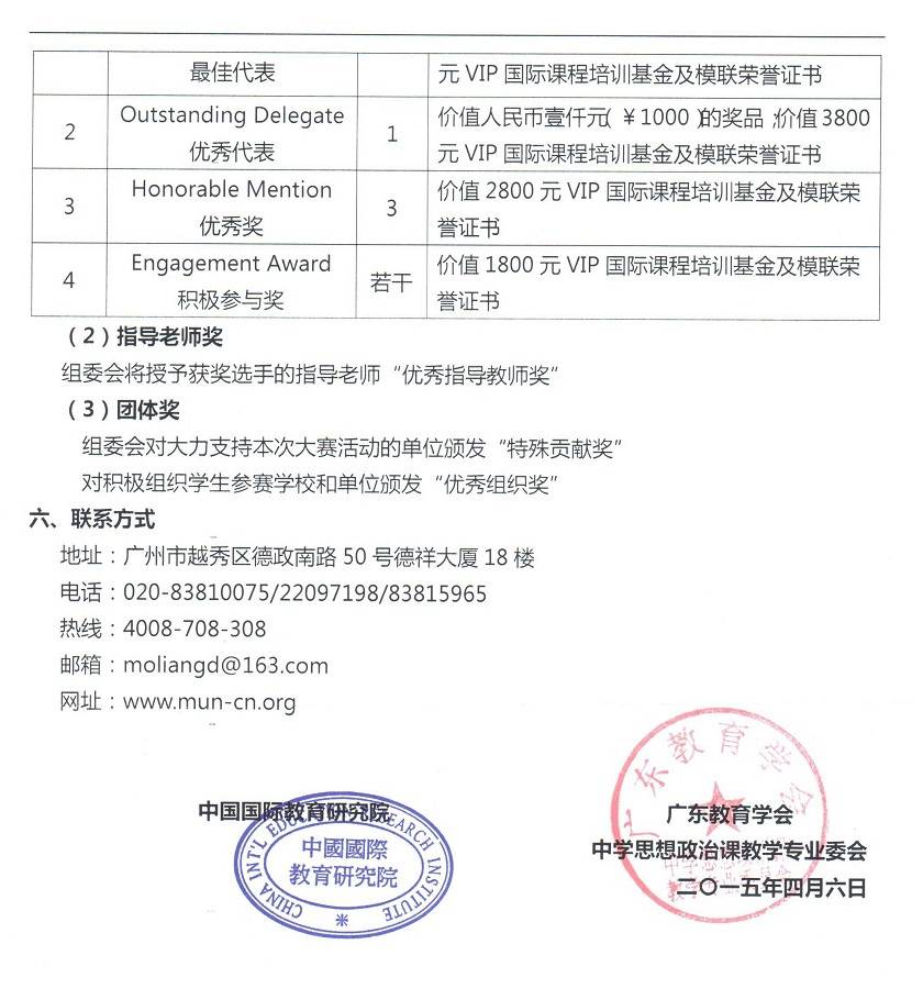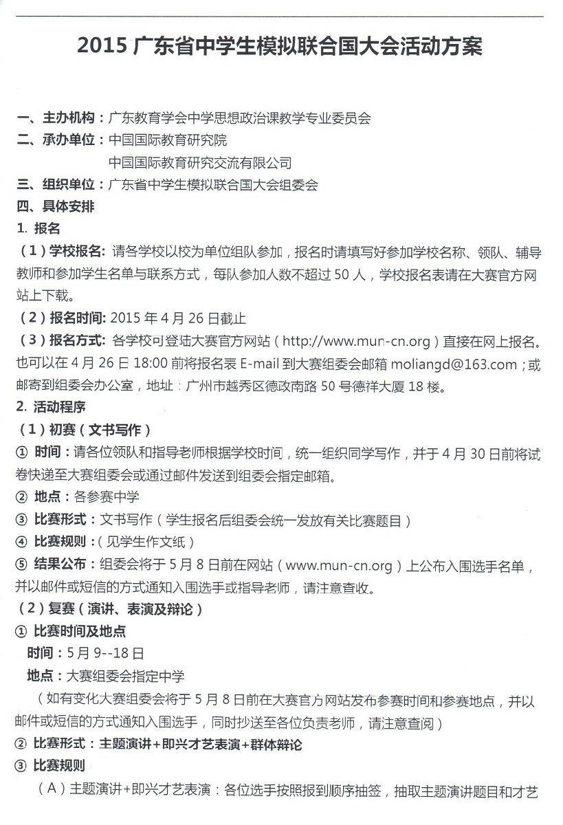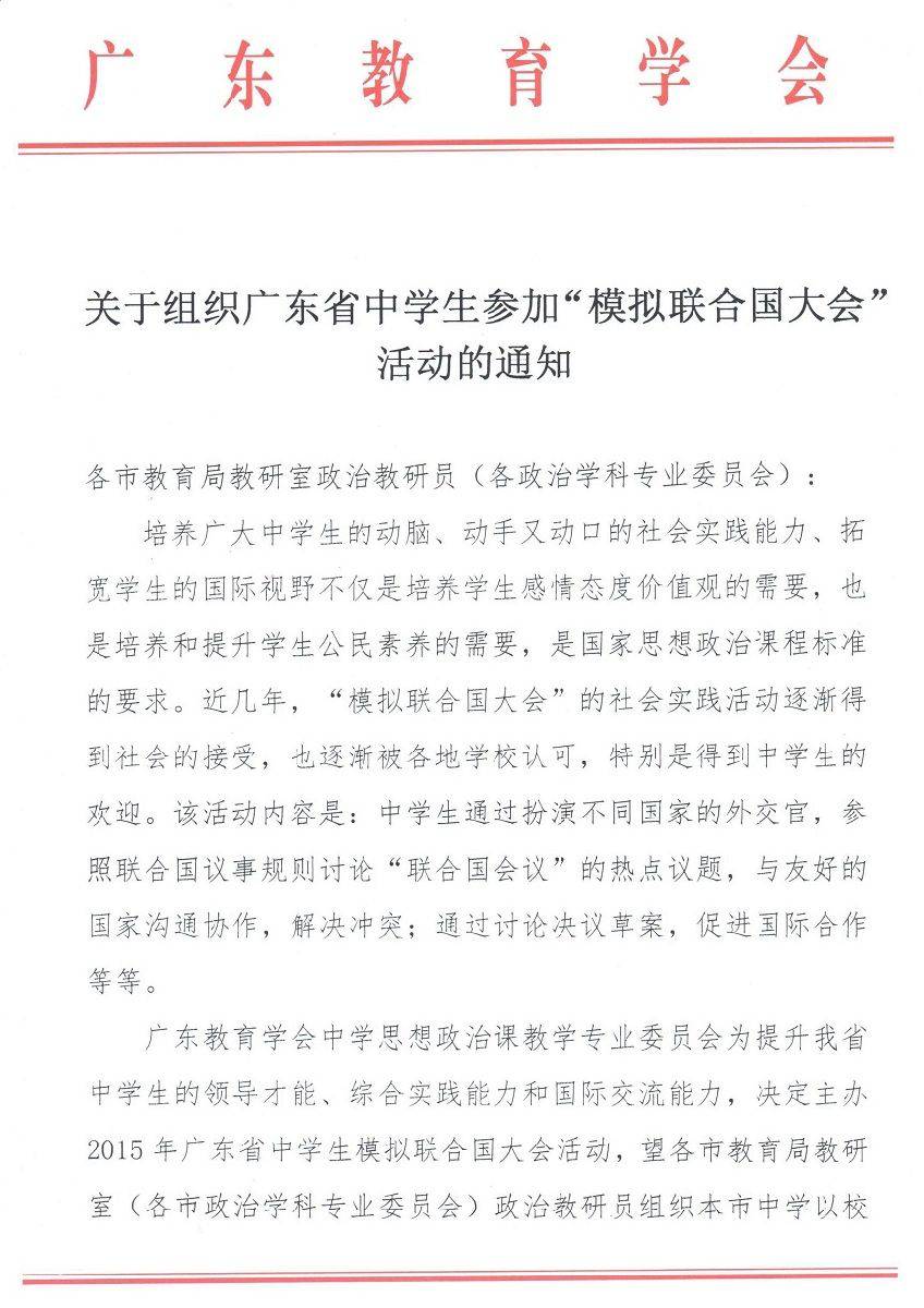 2015年4月7日,广东教育学会正式下发《关于组织广东省中学生“模拟联合国大会”活动的通知》至各市教育局教研室,这标志着新一年的“国际中学生模拟联合国大会“广东赛区的活动由广东教育学会主办,中国国际教育研究院承办,在全省开展“中学生模拟联合国大会”活动。