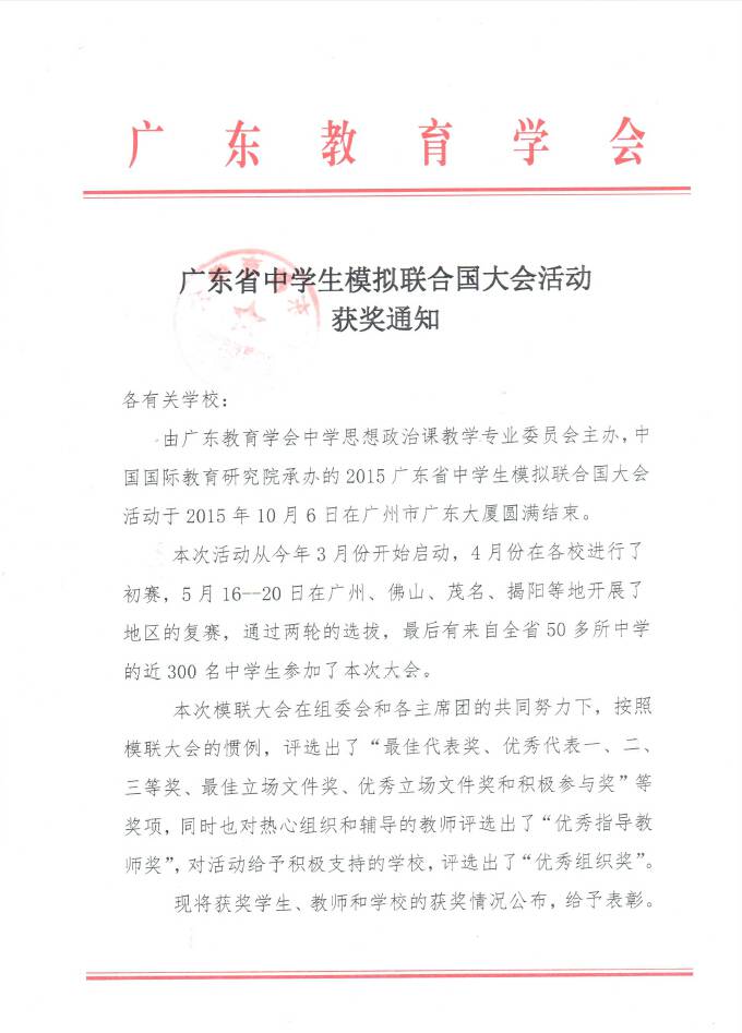 2015年广东省中学生模拟联合国大会【获奖通知】