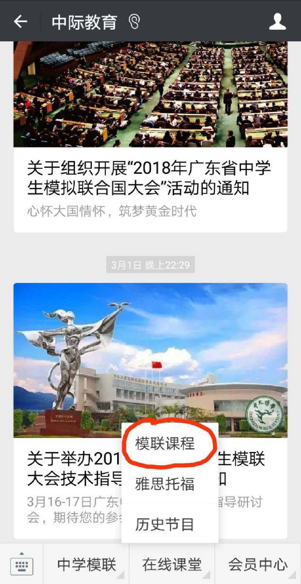 1、请关注中际教育公众号,微信“添加朋友”——点蓝色公众号按钮——搜索“中际教育”;或者扫描以下二维码,点击绿色按钮“关注”;在主界面找到“在线课堂”——选择“模联课程”;