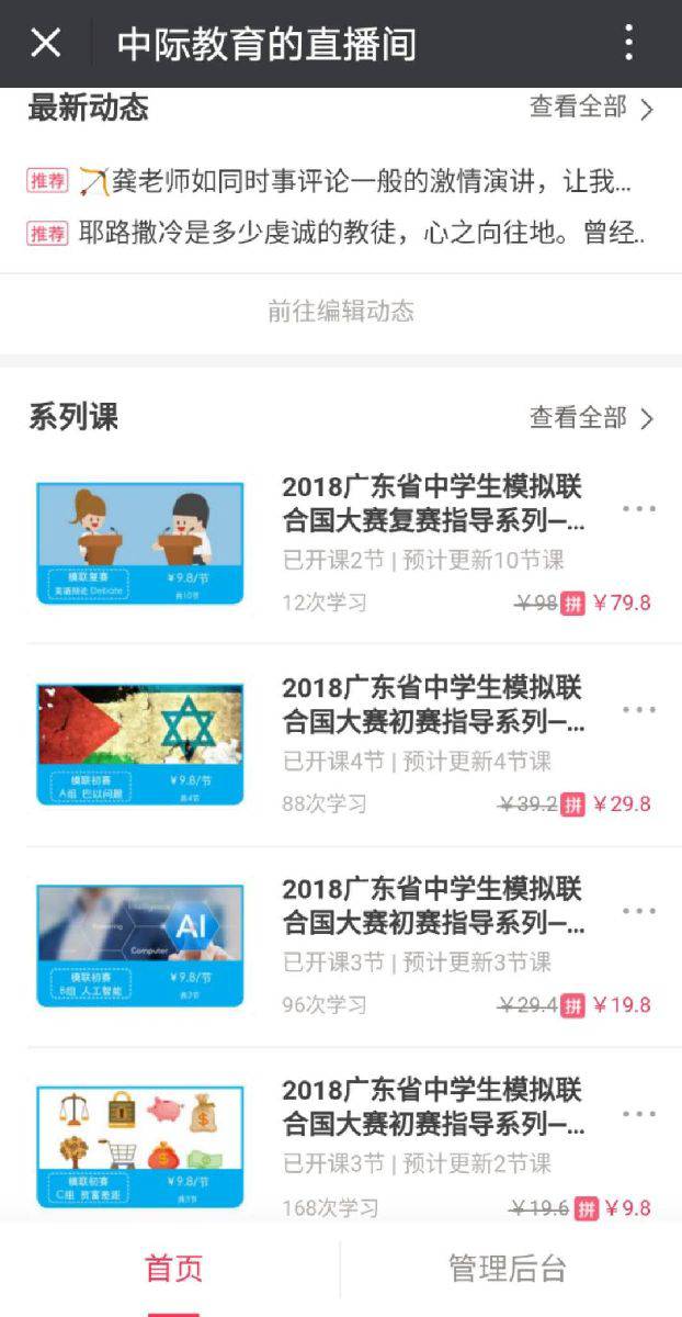 2、点击进入:中际教育直播间,选择课程。例如:模联初赛A组巴以问题、B组人工智能或C组贫富差距。