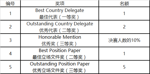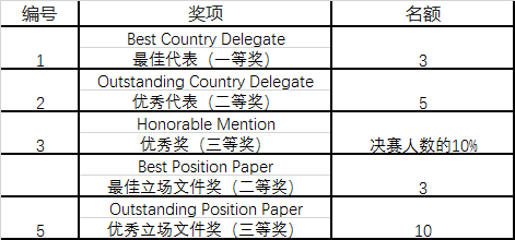 (6)结果公布:组委会将于4月25日前在网站(www.mun-cn.org)上公布入围选手名单,各大赛区的两个组别均按初赛人数的50%比例选拔选手进入复赛,并以邮件或短信的方式通知入围选手或指导老师。初赛总分50分,选手初赛总成绩的10%将被计入最终成绩。